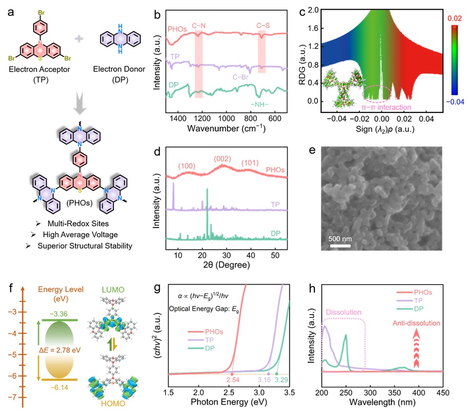 实验表征和理论计算表明,吩噻嗪和哌嗪单元结构通过卤键-仲胺的吸-给电子效应形成共轭聚合物(PHOs),展示出高密度双电子氧化还原活性中心、低能垒杂环电子离域路径和多给体-受体扩展共轭稳定骨架,有助于加快电子转移动力学和电极氧化还原速率,提高材料结构稳定性。