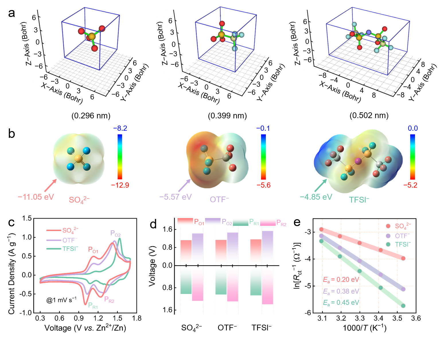 分子动力学模拟和电化学研究表明,随着阴离子Stokes半径的减小和电荷密度的增大,(TFSI−→OTF−→SO42−),SO42−阴离子通过超低活化能(0.20 eV)与PHOs发生配位反应。