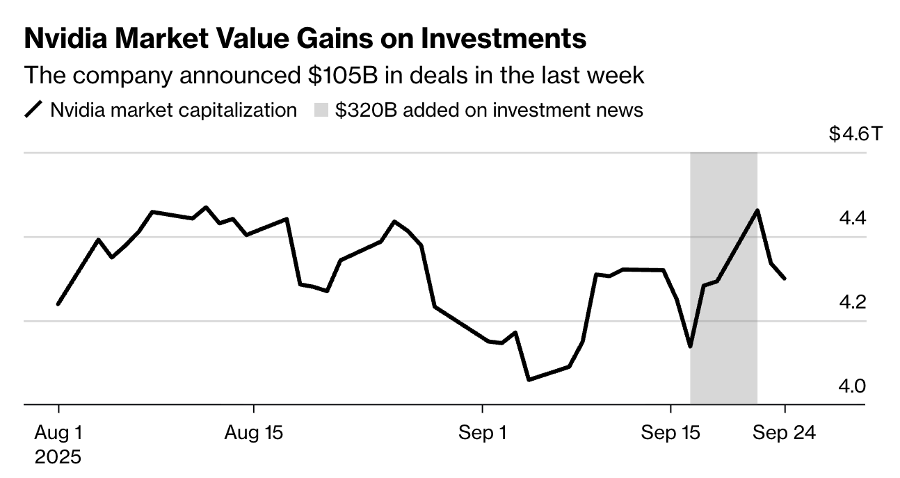 以英伟达为例。该公司上周宣布投资50亿美元入股竞争对手英特尔,并在本周一宣布计划向OpenAI投资最多1000亿美元。在这些投资计划公布后的三个交易日内,这家芯片制造商的市值增加了超过3200亿美元,是该公司预计在这两项协议中投入金额的三倍。