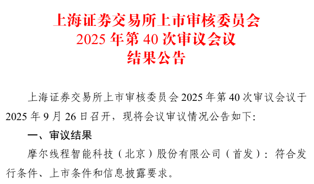 9月26日,据上海证券交易所上市审核委员会2025年第40次审议会议结果显示,摩尔线程智能科技(北京)股份有限公司(简称:摩尔线程)科创板IPO成功过会。