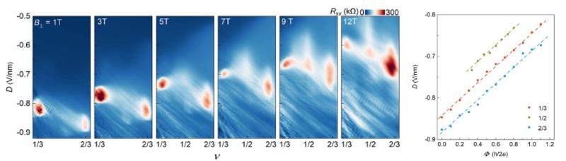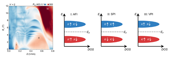 2. 多重绝缘相竞争:在 ν = 2 处,依赖于垂直电场与磁场的调控,出现自旋反铁磁绝缘体、自旋极化绝缘体以及谷极化绝缘体三种不同相态,反映出复杂的同位旋对称性破缺机制。