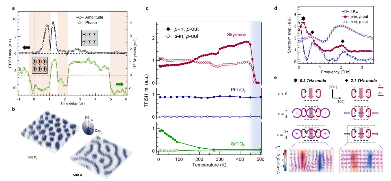 为进一步揭示隐藏极性相的形成机理,研究团队开发了干涉式太赫兹泵浦-二次谐波探测(iTFISH)技术。通过引入参考光与样品信号进行干涉,能够同时高灵敏度地提取信号的振幅和相位。团队首次将此技术应用于前沿拓扑材料体系,成功观测到斯格明子中瞬态宏观极化方向的多重翻转,并识别出~0.2THz和~2.1THz等多个激发的集体模式。研究的另一重要发现是斯格明子动力学的超宽温域稳定性。团队系统地研究了斯格明子超快动力学响应的温度依赖性,发现太赫兹诱导出的瞬态极性相可在4K至470K的超宽温度范围内稳定存在,直至在470K时发生拓扑相变后猝灭。这种源于拓扑保护的优异稳定性,有效突破了传统光控物态的温度限制,为研发能在常规环境下工作的高速光电器件奠定了物理基础。