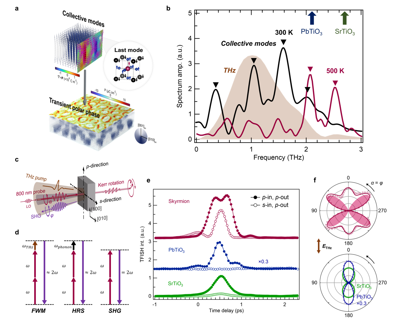 研究团队首先通过动力学相场模拟进行理论预测。模拟结果表明,极性斯格明子体系中存在着一系列频率在2THz以下的集体动力学模式,其频谱与实验中使用的强场太赫兹脉冲高度重合。与传统铁电体中对温度敏感的软声子模式不同,这些集体模式的频率在很宽的温度范围内几乎保持不变。这种稳定的谐振耦合通道可有效激发斯格明子中的极化偶极子,使其从原有的赝中心对称状态转变为一个具有宏观极化的瞬态隐藏极性相。随后,团队利用太赫兹场致二次谐波(TFISH)这一对材料对称性破缺敏感的实验技术,发现在太赫兹激发下,斯格明子产生了具有复杂各向异性的二次谐波信号,而作为参照的超晶格组分PbTiO₃和SrTiO₃则呈现单一方向响应。这一结果证实了斯格明子在光激发下发生了中心对称性破缺,成功诱导出了理论预测的瞬态极性相。