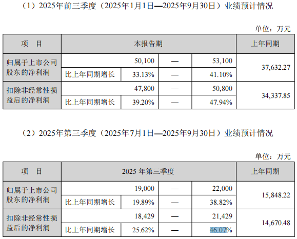其中,第三季度归属于上市公司股东的净利润约为19,000万元至22000万元,同比增长19.89%至38.82%。扣除非经常性损益后的净利润预计约为18429万元至21,429万元,同比增长25.62%至46.07%。