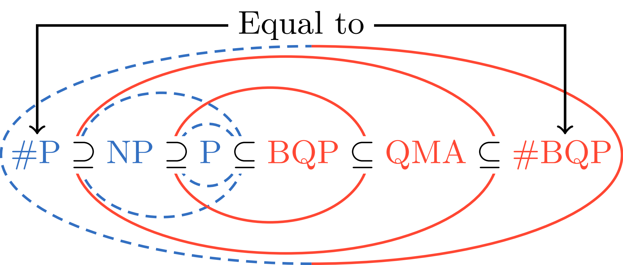 常见复杂度分类关系图。蓝色和红色分别代表经典和量子算法