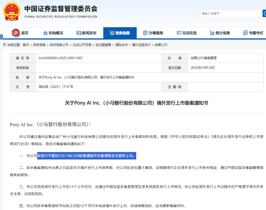 10月14日,证监会发布《关于Pony AI Inc.(小马智行股份有限公司)境外发行上市备案通知书》,这意味着小马智行港交所IPO备案正式获批。《通知书》显示,小马智行拟发行不超过102,146,500股普通股并在香港联合交易所上市。