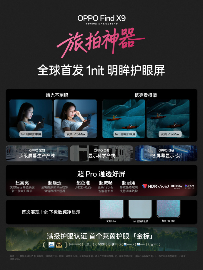 在屏幕上,OPPO Find X9系列首发1nit明眸护眼屏,把行业的护眼标准推向全新高度。传统屏幕最低亮度仅能降至2-5nit,用户在暗光环境下使用依然刺眼。为攻克这一痛点,OPPO通过超10亿资金投入,首创自研屏幕双产线,构建起了从发光材料研发、高端生产制造,再到超高精度校准的全链路自主体系;并在自研P3屏幕显示芯片和OPPO芯链技术的加持下,实现了引领行业的微米级实时子像素校准,让屏幕在1nit极暗环境下仍能呈现极致纯净、通透的显示效果。