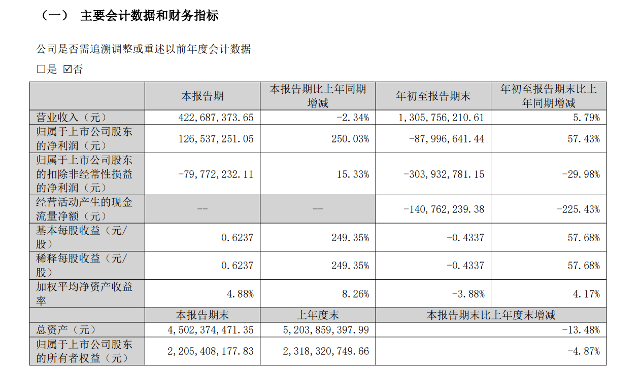 10月22日,发布2025年第三季度报告。公司2025年第三季度营业收入为4.23亿元,同比下降2.34%;归属于上市公司股东的净利润为1.27亿元,同比增长250.03%。年初至报告期末,营业收入为13.06亿元,同比增长5.79%;归属于上市公司股东的净利润为-0.88亿元。截至三季度末,公司总资产45.02亿元,较上年度末下降13.5%;归母净资产为22.05亿元,较上年度末下降4.9%。