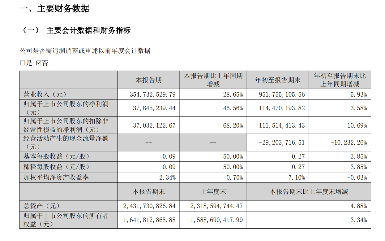 2025年前三季度,高盟新材累计实现营业收入9.52亿元,同比增长5.93%;归母净利润1.14亿元,同比增长3.58%;扣非净利润1.12亿元,同比增长10.69%。
