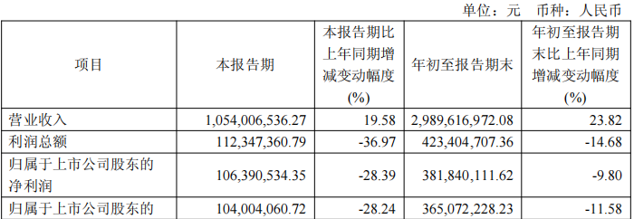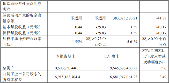1-9月累计归属于上市公司股东的净利润3.82亿元,同比下降9.8%;累计归属于上市公司股东的扣除非经常性损益的净利润3.65亿元,同比下降11.58%;基本每股收益与稀释每股收益均为1.59元/股,同比下降10.17%;加权平均净资产收益率5.61%,较上年同期减少0.9个百分点。