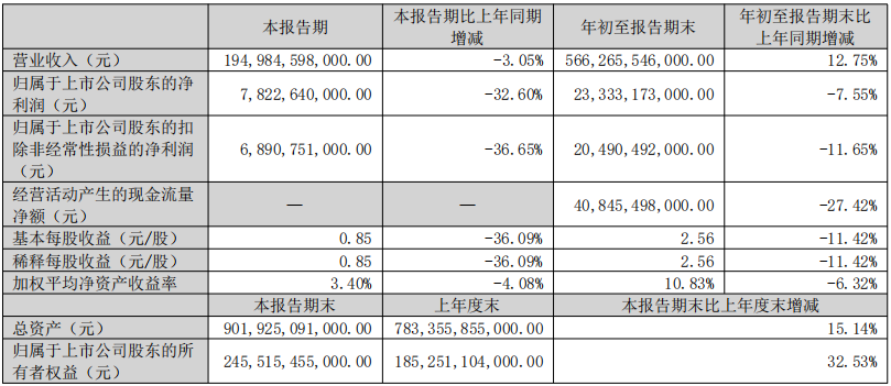 从年初至报告期末(2025年1-9月),公司经营韧性凸显,实现营业收入5662.66亿元,较上年同期增长12.75%;归属于上市公司股东的净利润233.33亿元,同比下降7.55%;归属于上市公司股东的扣除非经常性损益的净利润204.9亿元,同比下降11.65%。基本每股收益为2.56元/股,同比下降11.42%(注:因2025年7月实施权益分派,总股本增加,每股收益按调整后股数计算)。