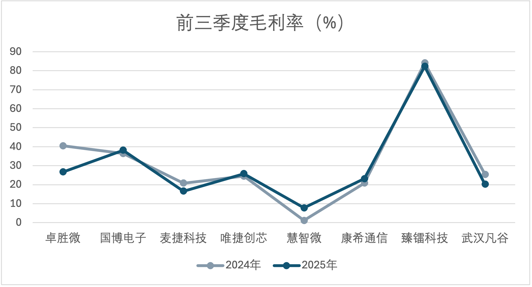 部分企业面临净利润下滑甚至亏损加剧的困境。卓胜微净利润从2024年前三季度的4.25亿元转为亏损1.72亿元,同比下降140%;慧智微和康希通信虽然仍处于亏损状态,但亏损幅度分别收窄58.98%和9.86%,经营状况持续向好。其中康希通信在2025年1-9月共计产生5,059.93万元诉讼及律师费用(含2025年第三季度1,336.77万元),金额相对较高,是影响公司净利润的主要因素;武汉凡谷净利润从4656.69万元转为亏损1023.83万元,同比下降122%。这反映出在市场回暖过程中行业竞争同时加剧,企业在成本控制、产品定价、市场拓展等方面面临着不同程度的挑战。