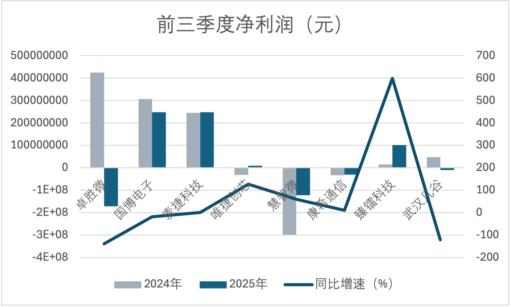 净利润方面,各企业的表现同样分化明显。臻镭科技净利润从2024年前三季度的1446.28万元大幅增长至2025年前三季度的1.01亿元,同比增幅高达598.09%,展现出强劲的盈利能力提升。麦捷科技净利润基本保持稳定,同比微增0.62%。唯捷创芯成功实现扭亏为盈,从2024年前三季度亏损3212.20万元到2025年前三季度盈利859.76万元,同比大增126.77%,其中三季度扣非净利润1283.33万元,同比上升126.36%。