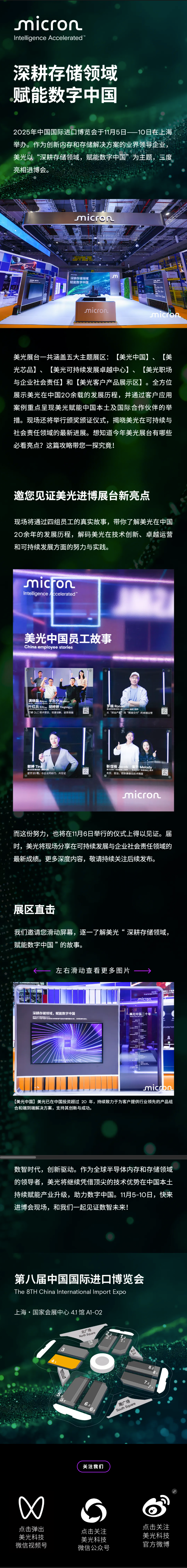 准备好探索美光2025进博会展台亮点了吗? 作者: 爱集微 11-06 09:55 相关舆情 AI解读 生成海报 来源:爱集微 #美光# 评论 收藏 点赞 1.5w 责编: 爱集微 来源:爱集微 #美光# 收藏 点赞 分享至: 微信扫一扫分享 THE END *此内容为集微网原创,著作权归集微网所有,爱集微,爱原创 相关推荐 美光宣布退出消费级存储器业务,专注AI及数据中心市场 云巨头抢签内存产能,2026年或将持续面临短缺 日经:美光将在日本广岛建新工厂 日本再砸70亿美元,扶植“旗舰项目”Rapidus 美光出货车用UFS4.1:解锁快速、安全、可靠的智能出行体验 美光科技将在韩国大举招聘 争抢HBM人才 +关注 爱集微 微信: 邮箱:laoyaoba@gmail.com 12.1w文章总数 12012.5w总浏览量 最近发布 SK海力士荣获全球半导体联盟2025年度两项大奖 5小时前 刚刚递表港交所!这家公司核心产品全球份额第一 5小时前 天玑芯片彻底拿捏能效与性能,OPPO新机体验拉满 5小时前 估值210亿的AI芯片公司,正剑指港股IPO;苹果或许正在赢得AI竞赛! 5小时前 沉寂三年,再度归来!一家公司科创板IPO进程重启 5小时前 获取更多内容 最新资讯 烁科中科信获国新基金投资,系半导体离子注入装备领域龙头企业 39分钟前 韩国政府补助、减税并进,促进科技竞争力升级 44分钟前 AWS首款3纳米自研晶片亮相 与英伟达合作 55分钟前 Meta削减元宇宙经费转向AI穿戴装置 1小时前 吴清重要讲话!为“十五五”期间证券行业规划清晰发展路径 1小时前 台积电凤凰城晶圆厂投产遇挑战 1小时前