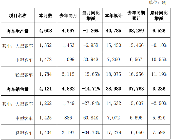 数据显示,10月公司客车生产量为4608辆,较去年同月的4667辆同比下降1.26%;当月客车销售量为4121辆,较去年同月的4832辆同比下降14.71%。