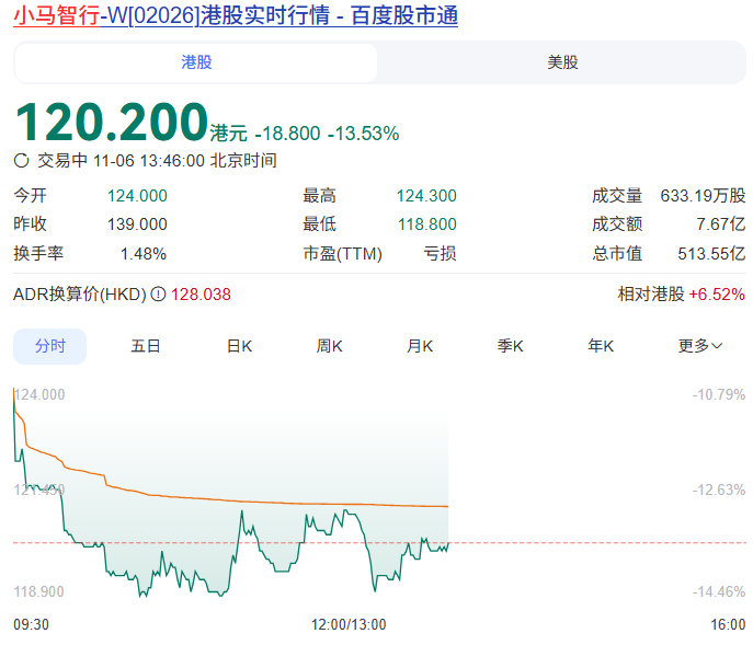 11月6日,小马智行正式登陆港交所,截至发稿,实时股价为120.2港元/股,较139港元/股发行价降幅达13.53%,总市值为513.55亿港元。