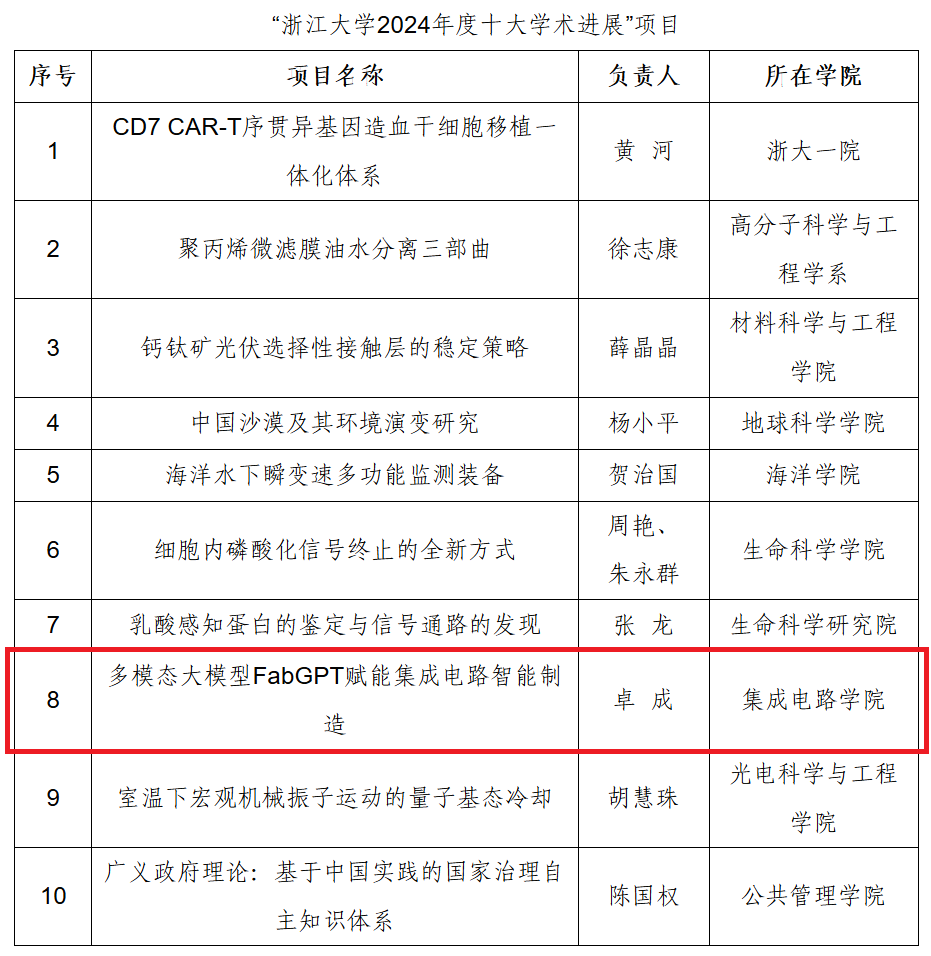 近日,浙江大学公布2024年度“十大学术进展”名单,我院卓成教授团队研发的“多模态大模型FabGPT赋能集成电路智能制造”学术成果成功入选。