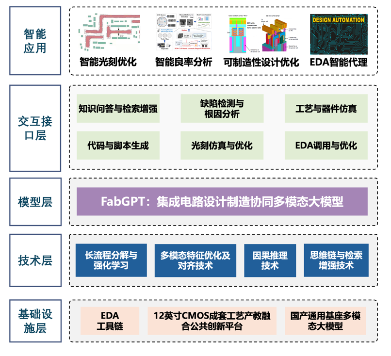 针对集成电路制造在小数据条件下面临的建模难、工艺理解难和高维优化难等关键挑战,团队研制了面向集成电路设计制造协同的多模态大模型框架FabGPT,在虚实融合建模、多模态工艺理解、超高维智能优化等方向取得了系列成果:实现光刻仿真、掩模优化与规则检测的一体化协同,整体效率提升约85倍;晶圆缺陷检测精度提升至96%;超高维参数优化效率提升3个数量级。