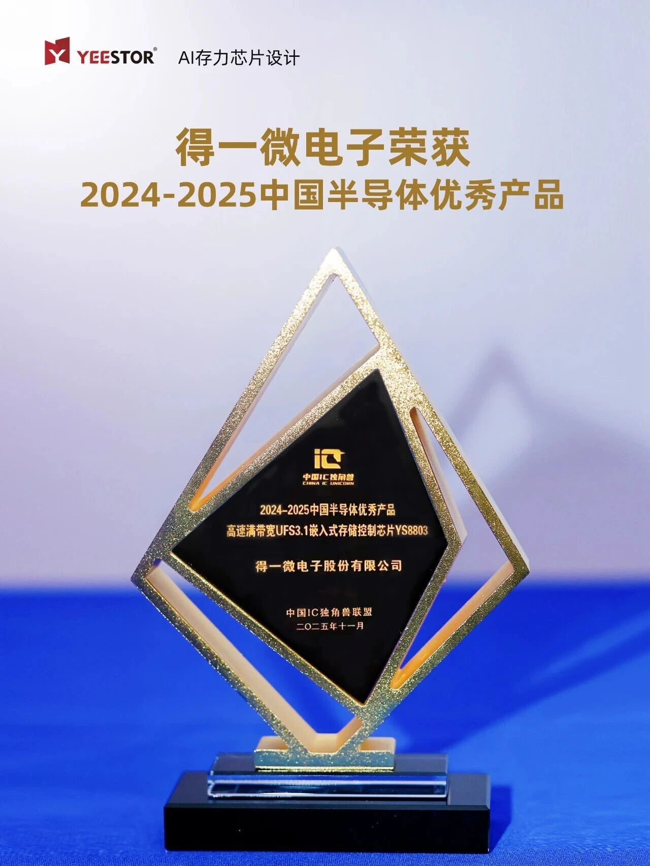 近日,在上海举办的2025第八届中国IC独角兽论坛暨中国半导体行业高质量发展创新论坛上,得一微电子UFS3.1存力主控芯片YS8803荣获“2024-2025中国半导体优秀产品”奖。作为中国大陆首款面向公开市场的UFS3.1存力主控,YS8803凭借卓越的高性能存力表现,正成为加速生成式AI在移动端普及的关键力量。