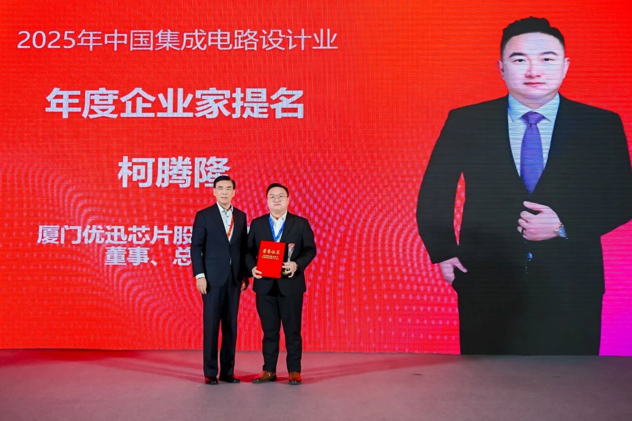 在集成电路产业的高光舞台上,优迅股份再添殊荣!11月21日,在第三十一届集成电路设计业展览会(ICCAD-Expo 2025)闭幕晚宴上,备受行业关注的“IC设计业年度企业家”评选结果重磅揭晓——优迅股份总经理柯腾隆荣膺“IC设计企业家提名奖”!该奖项由中国半导体行业协会集成电路设计分会理事长魏少军教授亲自颁发,这一荣誉是行业对柯腾隆总经理及优迅股份的高度肯定。