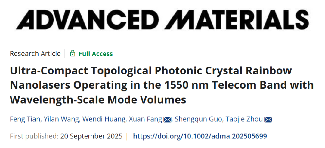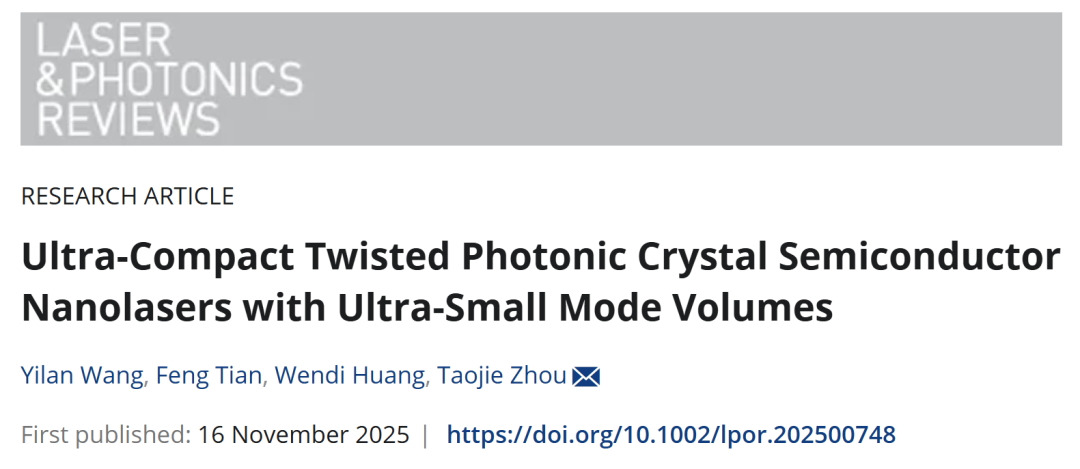 近日,周陶杰副教授课题组在1550 nm光通讯波段光子晶体半导体纳米激光器领域取得新进展,研究成果以“Ultra‐Compact Twisted Photonic Crystal Semiconductor Nanolasers with Ultra‐Small Mode Volumes”为题于11月16日发表在《Laser & Photonics Reviews》,以“One-Dimensional Moiré Flat-Band Nanolasers with Stable Single-Mode Emission”为题于11月14日发表在《Nano Letters》。上述研究工作由周陶杰副教授课题组独立完成,华南理工大学为论文唯一署名单位,2023级硕士研究生王依澜为第一作者,周陶杰副教授为通讯作者。