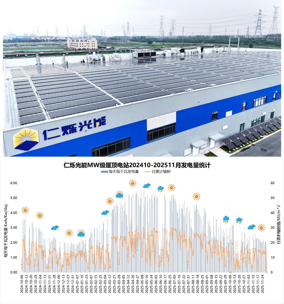 图为2024年10月至2025年11月,量产型大尺寸钙钛矿光伏组件在仁烁光能(苏州)有限公司屋顶电站实测的发电表现。(南京大学供图)