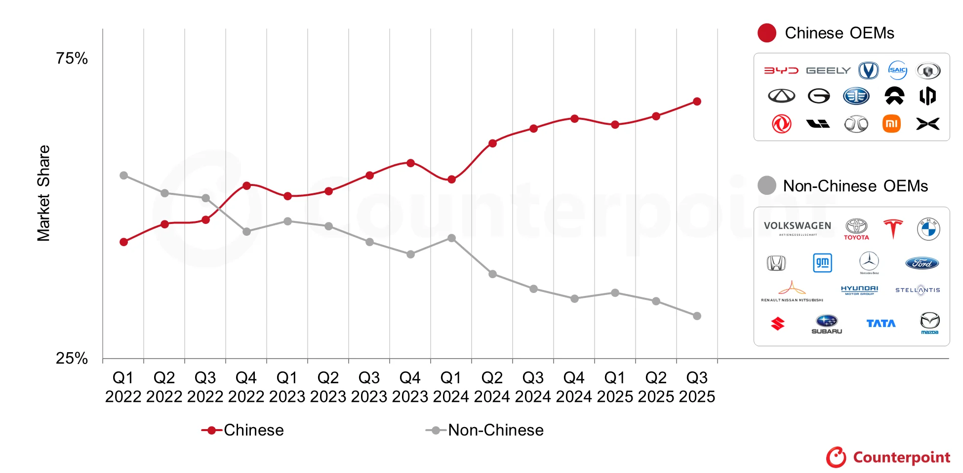 该机构称,过去三年,中国汽车集团的市场份额发生了惊人的重组。由于中国汽车集团将互联技术视为一项关键技术,认为它能够帮助它们更好地在全球最大的汽车市场——中国——展开竞争,并凭借比非中国汽车制造商更高的互联渗透率,提升其在全球市场的份额,因此,它们在中国互联汽车市场的份额从2022年第三季度的约48%增长至2025年第三季度的68%。根据Counterpoint的数据,非中国汽车制造商在中国互联汽车市场的销量份额则从2022年第三季度的52%大幅下降至2025年第三季度的32%。