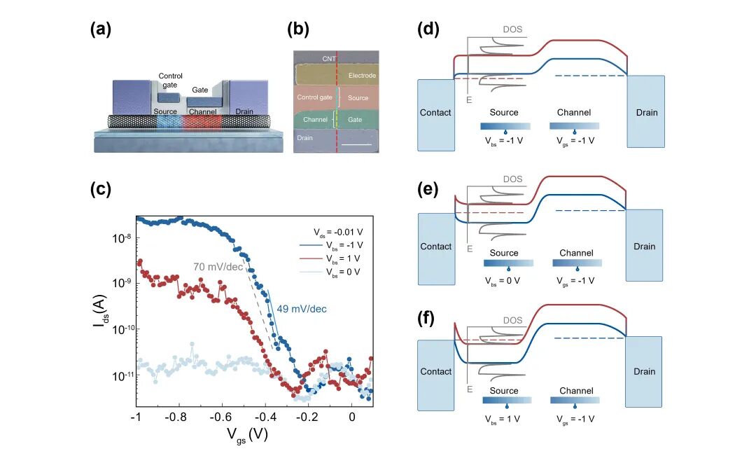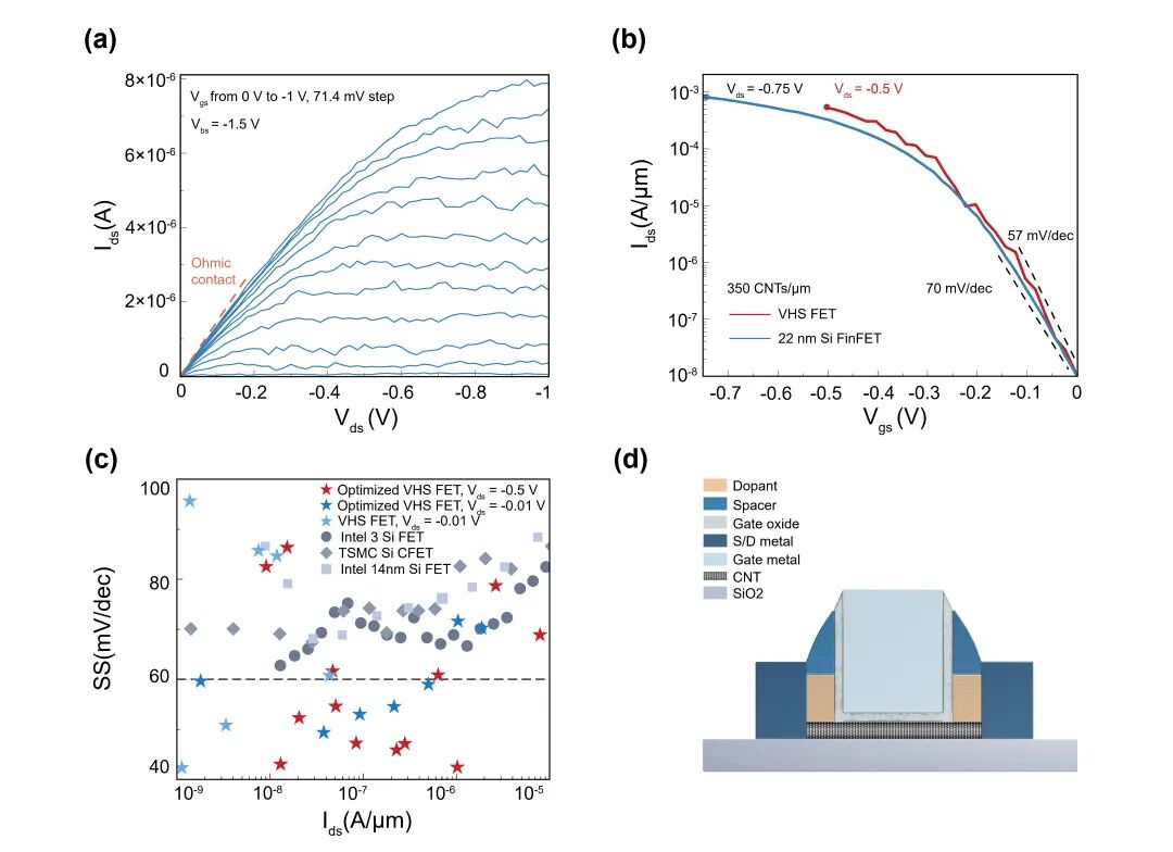 研究团队选择半导体型碳纳米管来构建范霍夫源和沟道(图2)。在这种器件中,主栅负责开关控制,辅助控制栅则精确调节源区费米能级。当费米能级靠近碳纳米管的范霍夫奇点时,源态密度随能量急剧下降,高能载流子被有效过滤,形成陡峭的热发射开关(图3)。实验结果表明,基于单根碳纳米管构建的VHS FET在室温下实现了49 mV/dec的亚阈值摆幅,显著突破玻尔兹曼极限。在450 nm栅长和0.5 V的工作电压下,该器件的归一化开态电流与22 nm节点硅基晶体管相当,而工作电压比硅基器件低0.25 V(图4)。这一结果表明,范霍夫源不仅能够实现亚 60 mV/dec的陡峭开关特性,还可兼顾高电流驱动能力,为发展新一代超低功耗陡坡晶体管提供设计思路。