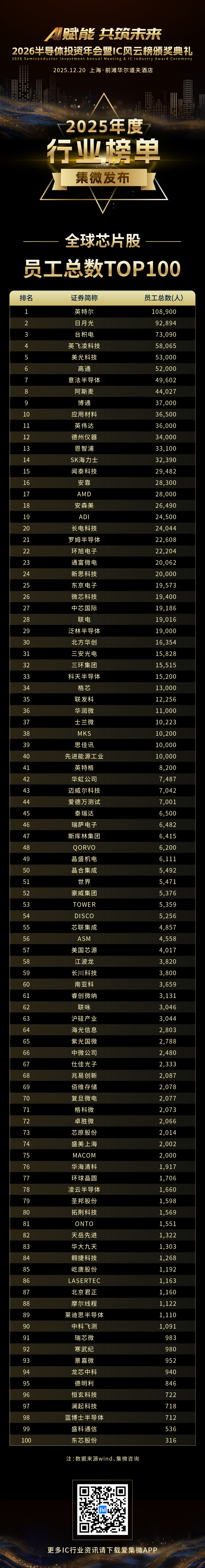 此为“全球芯片股”系列榜单之《全球芯片股——员工总数TOP100》。