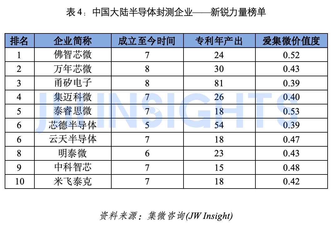 针对成立于近10年内的半导体封测企业,综合企业专利年产出量、专利价值度等多维度数据,爱集微知识产权咨询发布新锐力量企业十强榜单。