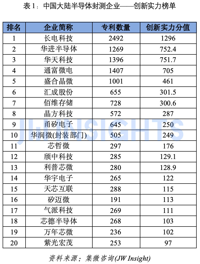 中国大陆半导体封测企业——创新实力榜单