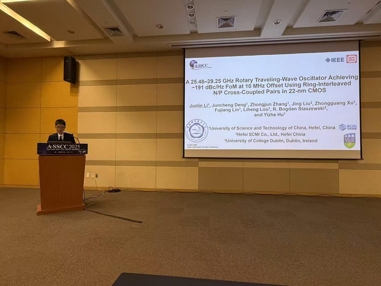 该成果以“A 25.48–29.25 GHz Rotary Traveling-Wave Oscillator Achieving −191 dBc/Hz FoM at 10 MHz Offset Using Ring-Interleaved N/P Cross-Coupled Pairs in 22-nm CMOS”为题发表。我院硕士研究生、论文第一作者李俊霖在大会Oscillators专题作现场汇报,我院博士生邓俊程为第二作者,胡诣哲教授担任通讯作者。该研究工作得到了合肥中科微电子创新中心有限公司资助,同时得到了安徽省集成电路科学与技术重点实验室的大力支持。