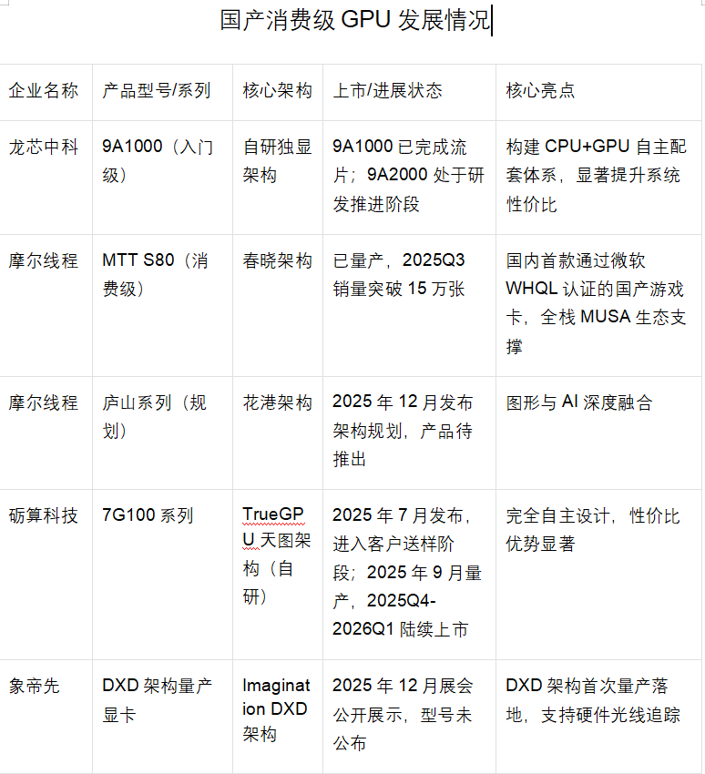 消费级 GPU 是衡量国内半导体产业综合实力的重要标志之一。当前,在政策支持、技术积累和市场需求的多重驱动下,国产消费级 GPU 已迈出从0到1的关键一步。随着生态建设的持续完善、技术能力的逐步提升,相信国产消费级GPU也将如云端GPU一样实现规模化突破,为我国数字经济发展提供核心硬件支撑。