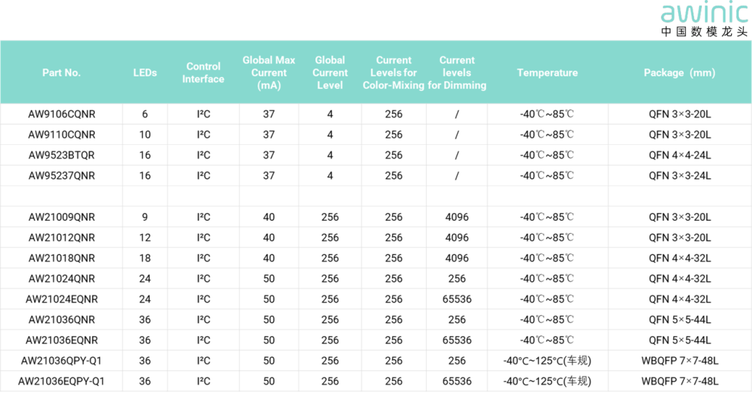 数模龙头艾为电子耕耘LED驱动市场15年,匠心打造极具特色的 “艾为灯语®” 系列产品矩阵。3~216 路 RGB LED驱动全场景目录化布局,全面覆盖消费电子、工业互联、汽车电子等多元领域。产品创新性搭载艾为创新的自主呼吸、蒙赛尔变色呼吸、音随我动等创新技术,以差异化竞争优势在市场中独树一帜,为客户提供专业高端的灯语解决方案。