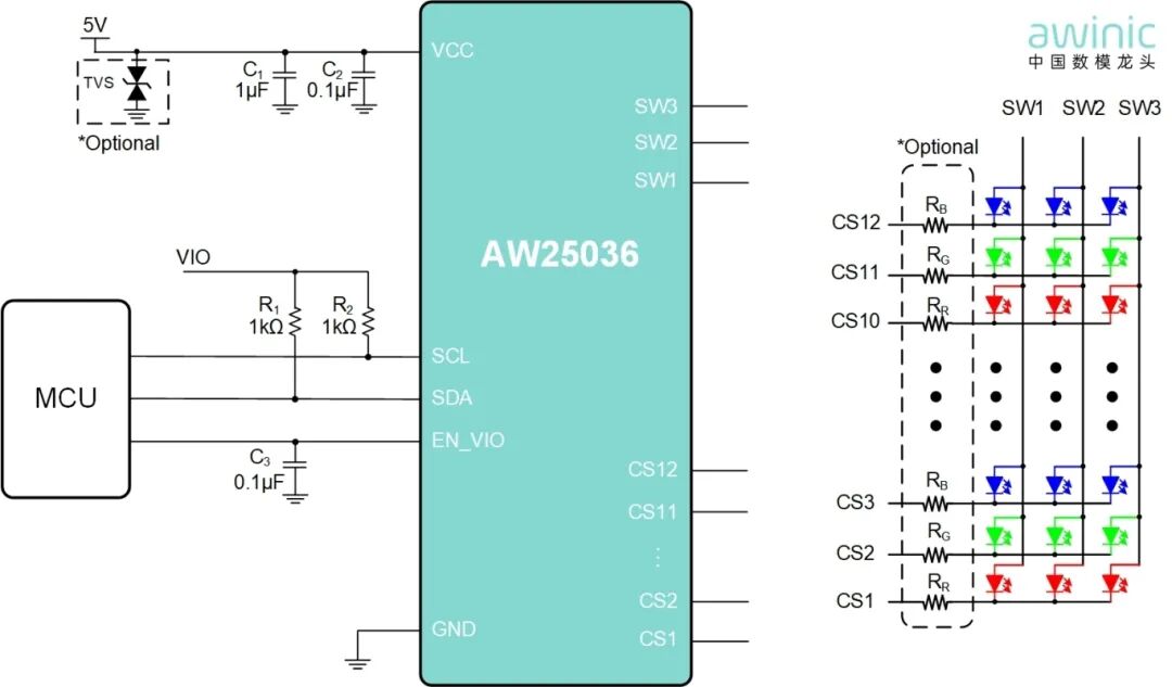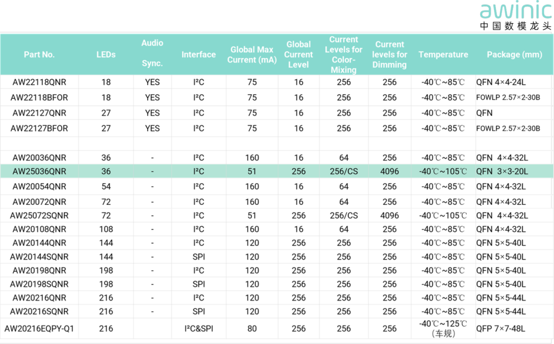 AW25036QNR是一款36 通道矩阵式 LED 驱动芯片,单通道最大输出电流可达 51mA,通道间电流精度高达 ±4%,确保多通道亮度一致性。每通道独立支持 4096 级(12-bit)PWM 调光,可实现全彩画面的细腻亮度过渡与精准色彩还原。该芯片创新性采用扩频调制技术、Slew Rate优化及 20kHz+ 超高频帧率的组合方案,彻底解决了 LED 驱动应用中陶瓷电容的啸叫难题。