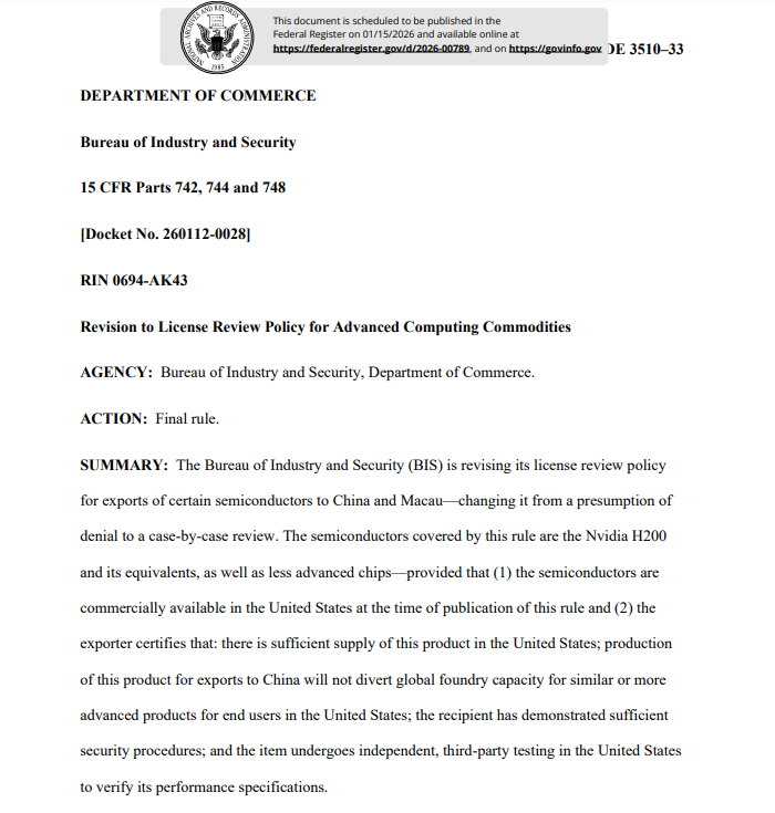 这项监管规定标志着落实特朗普总统上个月允许英伟达和其他芯片制造商向中国出售先进人工智能处理器的决定迈出了关键一步。这与2022年开始实施的旨在阻止中国获取美国最强大技术的政策相比,标志着政策的重大转变。(校对/赵月)
