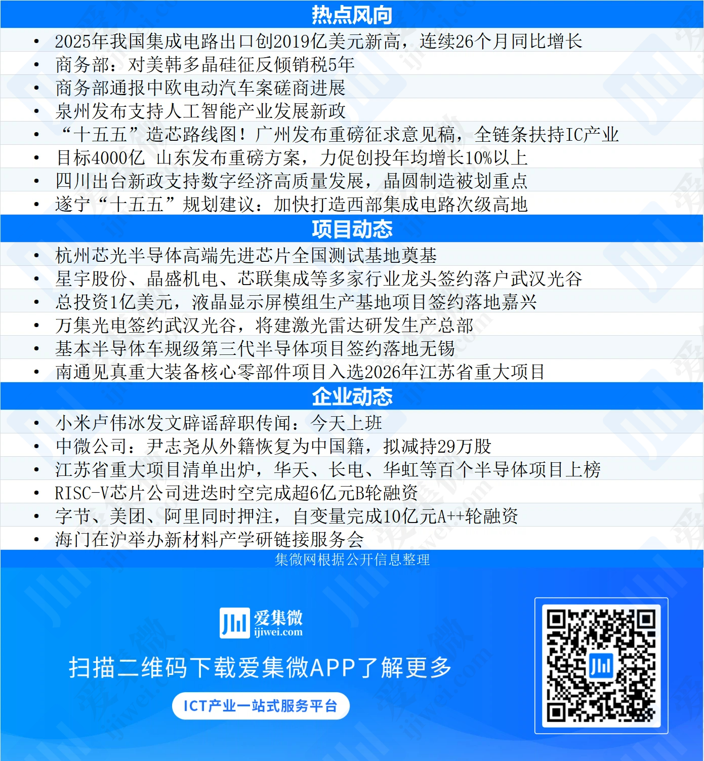 一周动态:我国集成电路出口创新高;中微公司董事长恢复中国籍 小米卢伟冰发文辟谣辞职传闻(1月9日-1月15日)