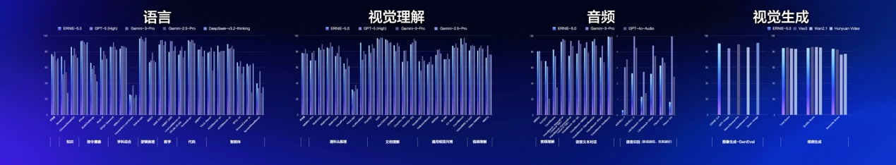 在40余项权威基准的综合评测中,文心 5.0 正式版的语言与多模态理解能力超越Gemini-2.5-Pro、GPT-5-High等模型,稳居国际第一梯队。图像与视频生成能力与垂直领域专精模型相当,整体处于全球领先水平。
