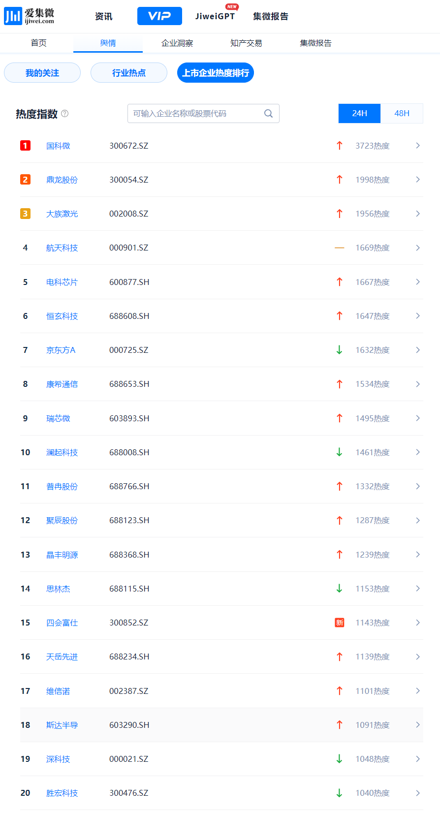 登录爱集微VIP频道,实时查看动态“上市企业热度排行”,穿透洞察每一个波动背后的驱动因素。