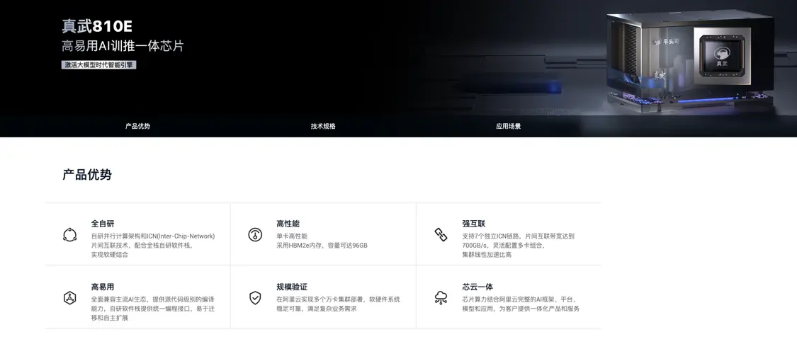 1月29日,阿里平头哥官网上线高端AI芯片“真武810E”产品信息,该芯片实现软硬件全自研,已在阿里云实现多个万卡集群部署,服务了国家电网、中科院、小鹏汽车、新浪微博等400多家客户。这是通义实验室、阿里云和平头哥组成的阿里巴巴AI黄金三角“通云哥”首次浮出水面。