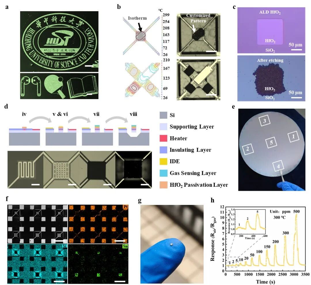 在上述基础上,研究团队成功实现了基于Pd/SnO2纳米颗粒的MEMS氢气传感芯片8英寸晶圆制造。芯片充分展现了MEMS器件小尺寸和低功耗优势,同时保留有纳米材料高灵敏、快响应优势,并具有晶圆级别的高一致性。该方法可以通过纳米材料结构和自组装过程调控、薄膜图案定制,进一步增强芯片的综合传感性能。