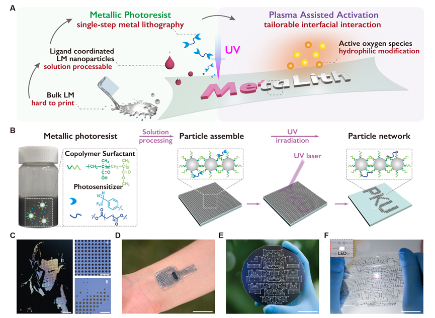 针对这一关键问题,北京大学集成电路学院郑雨晴团队成功研制出一种基于共晶镓铟液态金属(EGaIn)纳米颗粒的液态金属光刻胶,并开发了相应的等离子体辅助液态金属颗粒的激活策略,实现了单步晶圆级液态金属光刻图案化。该技术通过调控液态金属纳米颗粒/颗粒和颗粒/基底界面的共价与非共价相互作用,在保持超过750%拉伸性的同时,实现了2微米的分辨率、块体级电导率(2.2×104 S/cm)以及三维结构上液态金属图案共形加工。研究团队利用该技术成功制备了从高分辨率液态金属网格透明电极、皮层神经电极到大面积柔性印刷电路板等多尺度弹性电子器件,展示了其卓越的通用性。
