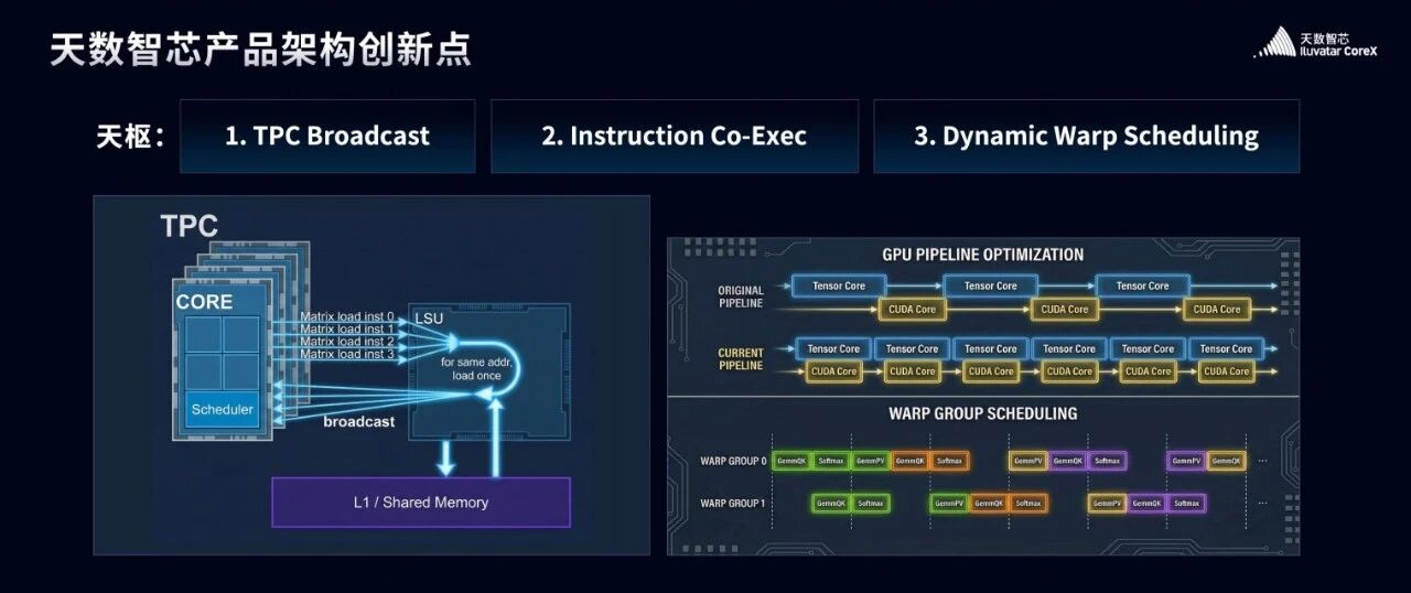 我们的指令处理系统可以同时运行不同指令,不单单是Tensor core和Vector core,我们同时加入了Exponent,通讯,三角函数等操作,在天数的IX-Scheduler模块中,用最小的cost增强了不同指令并行处理的能力,别担心MLA,也别担心Engram,更别担心DeepSeekV4,我们会并行的为你处理这些。