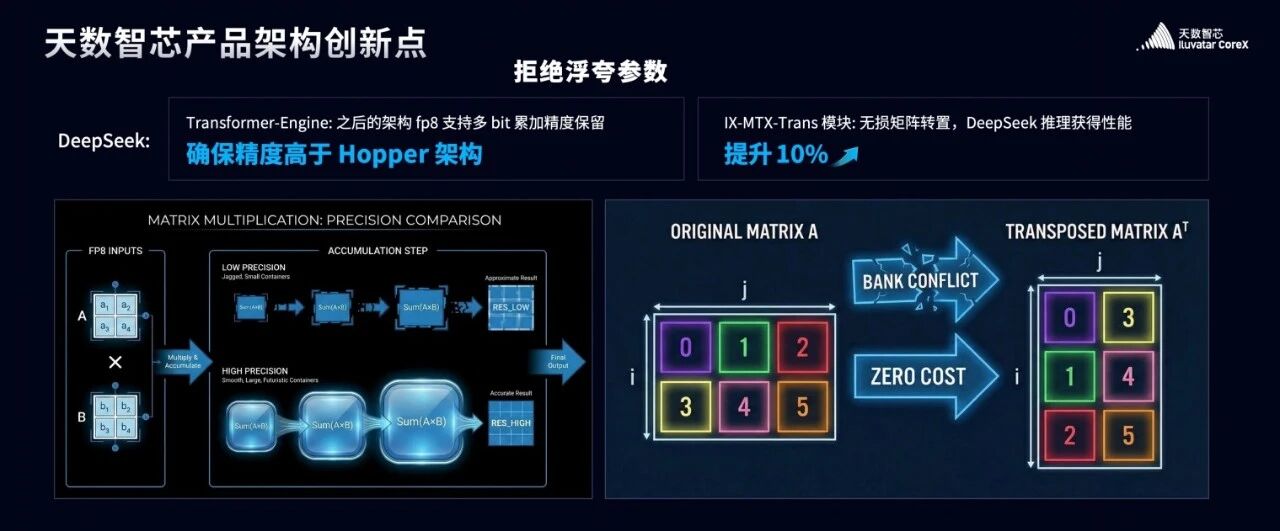 但在天数芯片的 Transformer-Engine 架构中,这个问题不复存在。 我们支持用户任意保留累加位数,实现了精度更高、更准的 FP8 计算,完美解决了这个精度焦虑。