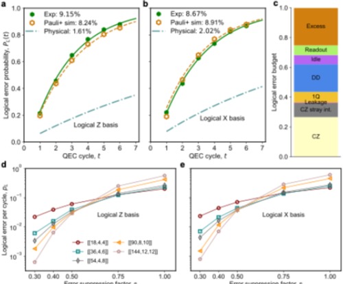 基于“昆仑”量子处理器,团队自主设计并在实验上演示了两种双变量自行车码:[[18,4,4]] 码和 [[18,6,3]] 码。前者利用18个数据比特编码4个距离为4的逻辑比特,后者编码了6个距离为3的逻辑比特。通过执行高效的非局域稳定子提取线路,团队成功演示了多轮量子纠错。实验结果表明,[[18,4,4]] 码和 [[18,6,3]] 码的平均逻辑错误率(按每轮、每逻辑比特统计)分别为8.91%和7.77%。此外,数值模拟预测,在所采用的噪声模型与解码设定下,若能将当前芯片的物理操作错误率降低至现有水平的一半,则可跨越双变量自行车码的纠错阈值,为未来突破盈亏平衡点奠定了基础。该工作在审稿阶段获得了同行专家的高度评价, 称其为“迈向容错且低开销量子计算重要而充满原创性的一步”。