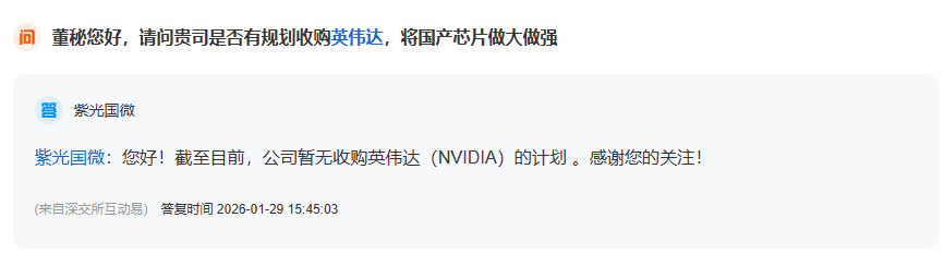 近日有股民在互动平台上提问:紫光国微公司是否有规划收购英伟达,将国产芯片做大做强。对此,紫光国微(002049)回答投资者提问时表示,截至目前,公司暂无收购英伟达(NVIDIA)的计划。