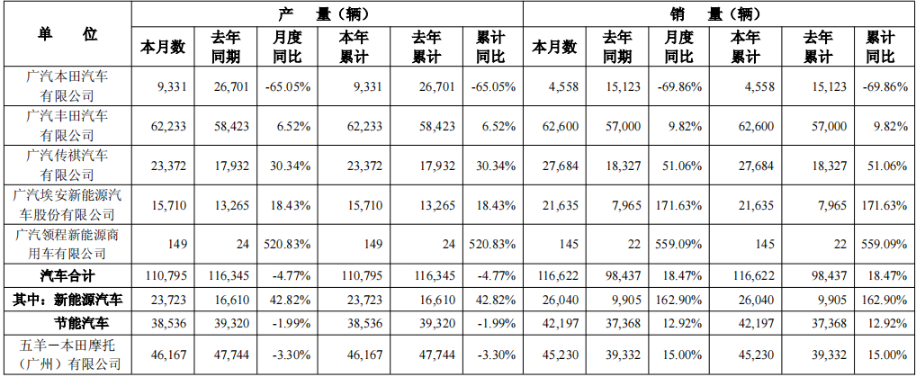 主要投资企业产销情况显示,广汽丰田1月销量为62,600辆,同比增长9.82%;广汽传祺销量为27,684辆,同比增长51.06%;广汽埃安新能源汽车销量为21,635辆,同比大幅增长171.63%。广汽本田1月销量为4,558辆,同比下降69.86%。