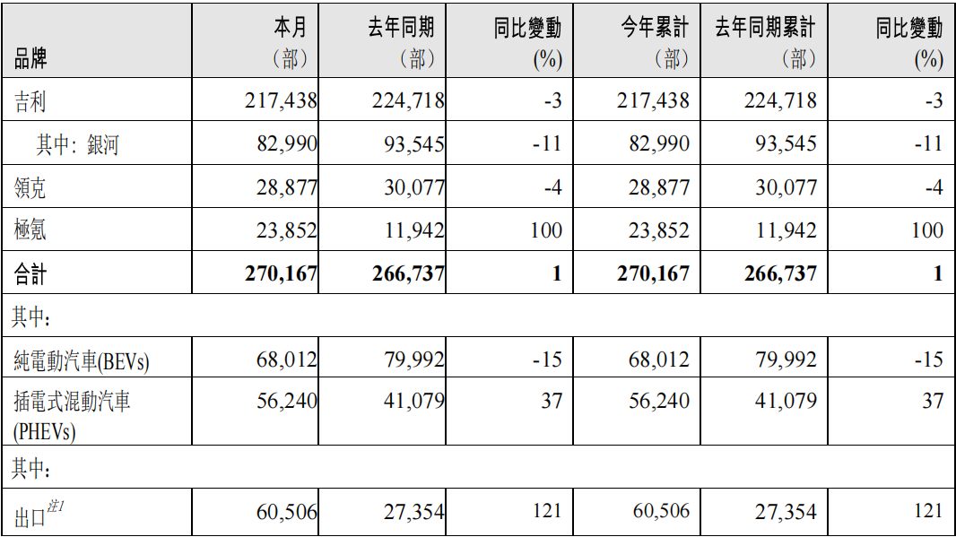 2月1日,吉利汽车宣布本集团于2026年1月总销量为270,167部,较去年同期增长约1%。