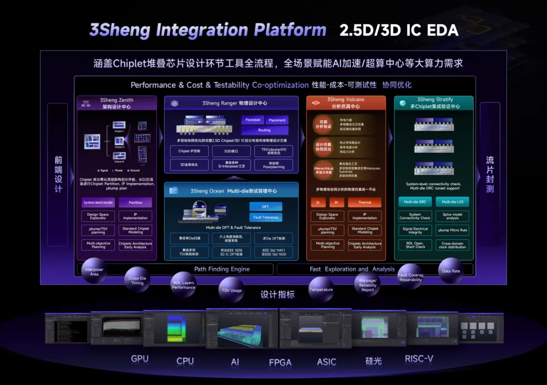 硅芯科技专注新一代2.5D/3D堆叠芯片EDA软件研发及产业化,是国内堆叠芯片后端设计全流程EDA的重要厂商。公司创始团队自2008年起深耕堆叠芯片设计方法,在后端布局布线、可测试性及可靠性等关键环节具备世界领先成果。其自主研发的3Sheng Integration Platform构建了覆盖系统级架构设计、物理实现、Multi-die测试容错、分析仿真及多Chiplet集成验证的闭环设计平台,形成先进封装Chiplet后端设计全流程解决方案,并已通过产业验证,在AI、GPU、CPU、FPGA、硅光等领域实现头部客户落地。