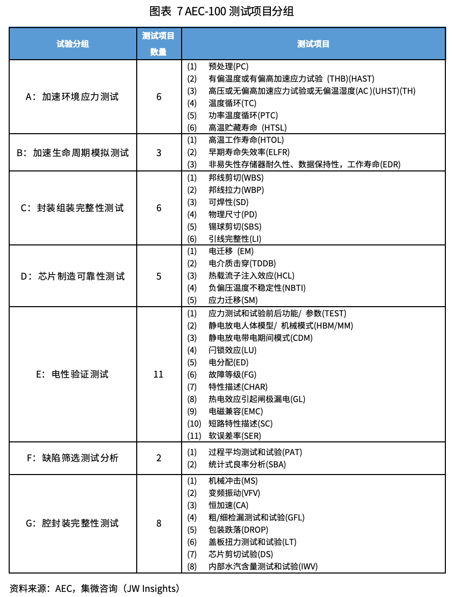 AEC-Q100一般称为“集成电路的应力测试标准”,该标准规范了7大类别共41项的测试,整个认证的测试项目涵盖了温度、湿度、机械冲击、振动、EMC,ESD,电迁移、应力迁移、热载流子注入、闩锁效应、芯片剪切等方面的试验。这些测试项目并不是适用于所有IC,需要根据IC的种类进行适配性的测试,也需要根据芯片的温度等级来进行测试条件的修改。根据DUT,至少有28项实验是必须要做的,否则不能声称物料通过了AEC-Q100认证。